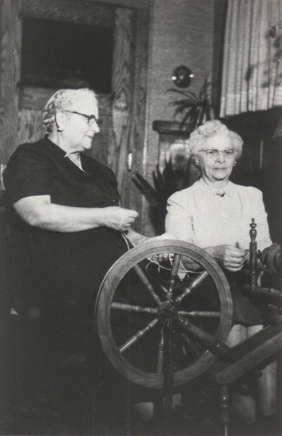 The historical connection, for me, is also a little more personal. This photo shows my very determined-looking great-grandmother Clara at the spinning wheel, with her sister Allie at her side. It looks to me like they are about to replace the missing or broken drive band. The sisters were born in Wisconsin, Allie in 1881 and Clara in 1887, and this photo was taken sometime around 1960 when they were in their 70s.