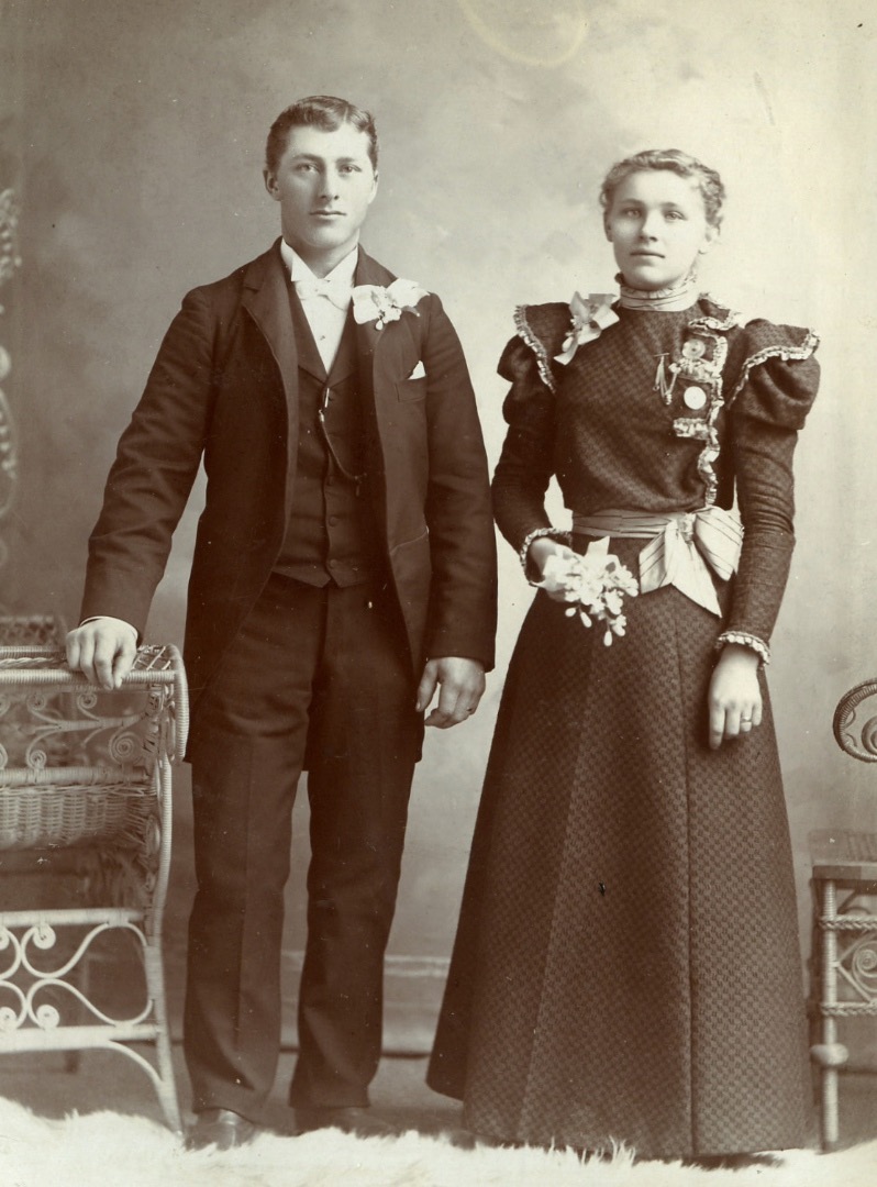That youngest daughter, Agusta Christina Hannah Anna Wilhelmina (!), grew up in Wisconsin. When she was eighteen, she married a farmer named Edward, whose parents had also emigrated from Pomerania. Agusta and Edward had seven children together, including Clara and Allie. Wisconsin German was probably spoken at home, in school, and other public venues due to the large German community in Wisconsin at that time (about a third of the population).