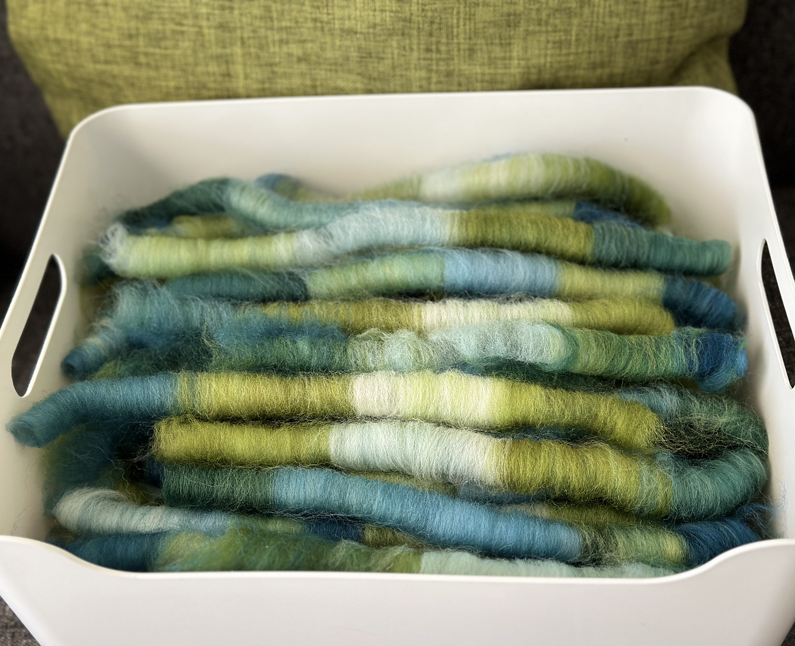 One woolen prep option is making batts on a drum carder, but drum carders are expensive and take up a lot of room. But making rolags, airy tubes of fiber that you spin from the end, is more accessible. You can make them on hand carders, or make fauxlags (which are super cool), but both methods seemed like it would take forever to make any substantial quantity. As a happy medium, I got a blending board so I can transform any of my combed top stash into rolags.