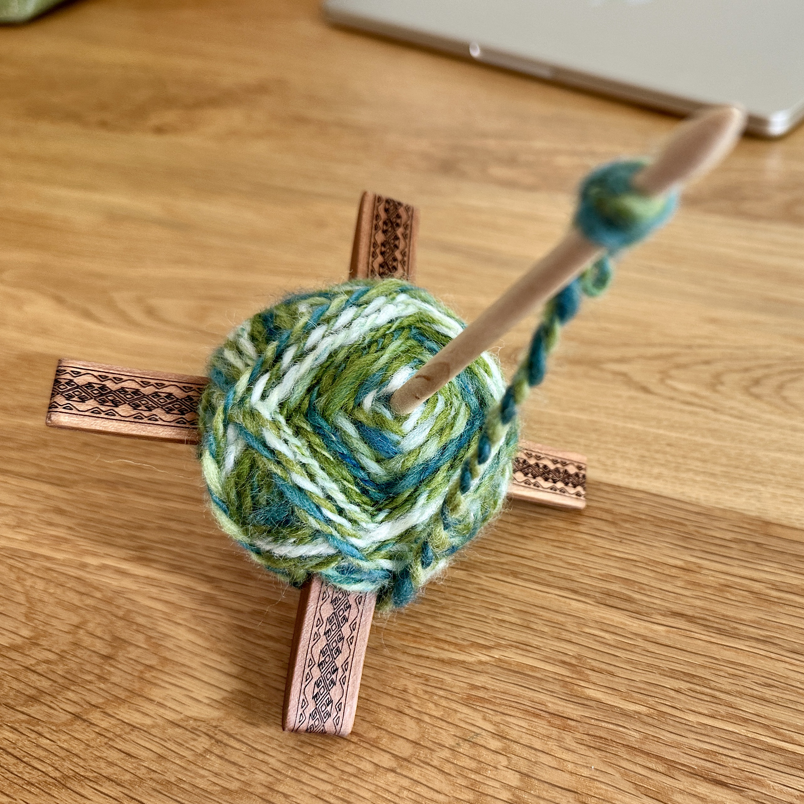 This fancy wrapping helps to keep the yarn tidy and untangled. The over-2-under-1 winding pattern also looks pretty, especially with a variegated yarn. It’s a little tricky to do at first, but gets easier with practice. I didn’t think I would have the patience to wind the cop in this fancy way, but it is somehow strangely compelling and soothing. The process is slowwww… but it’s more about the journey than the destination. It strikes me as being like a fidget spinner (which I love) that has an additional, practical purpose.