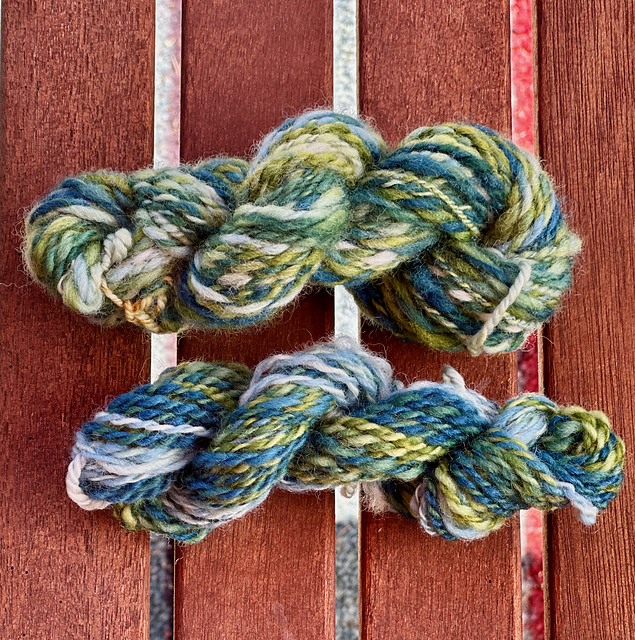 I wound off both the initial yarn and the new yarn, measured it, and finished it. The yarn behaved a lot better once it was plied and finished. In the photo below, you can see that the top skein (woolen prep) is thicker and fuzzier than the bottom one (worsted prep) because there’s more air in it.