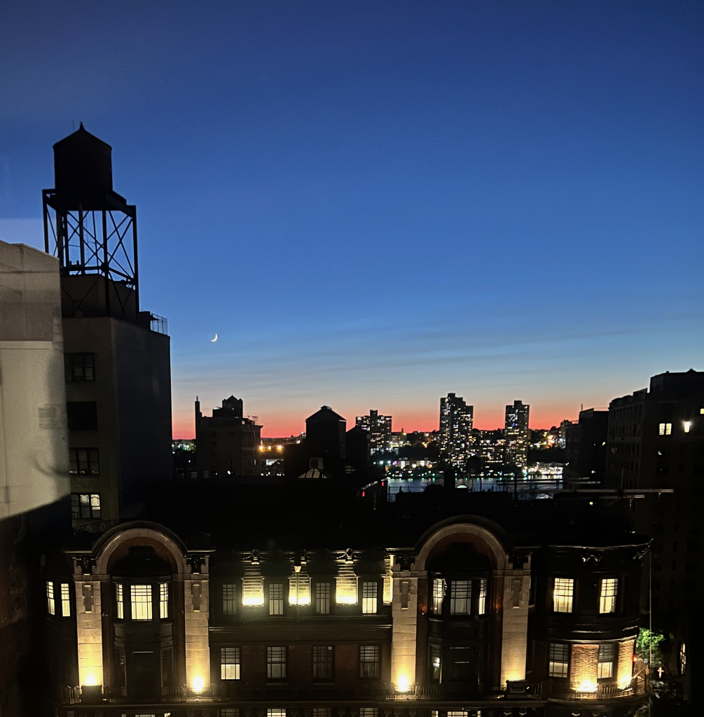 Baltimore Penn Station, on the wayHotel Belleclaire / UWSOutdoor dining pods, somewhere near West 77thBecause of course there is yarn in this storyAmerican Museum of Natural HistoryCathedral Parkway / W110thRiverside ParkPeople’s Garden W111thDarlene’s Sunset over the Hudson