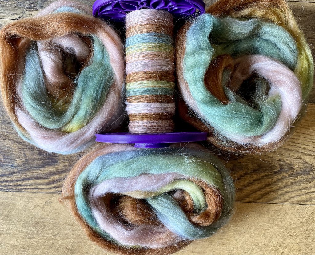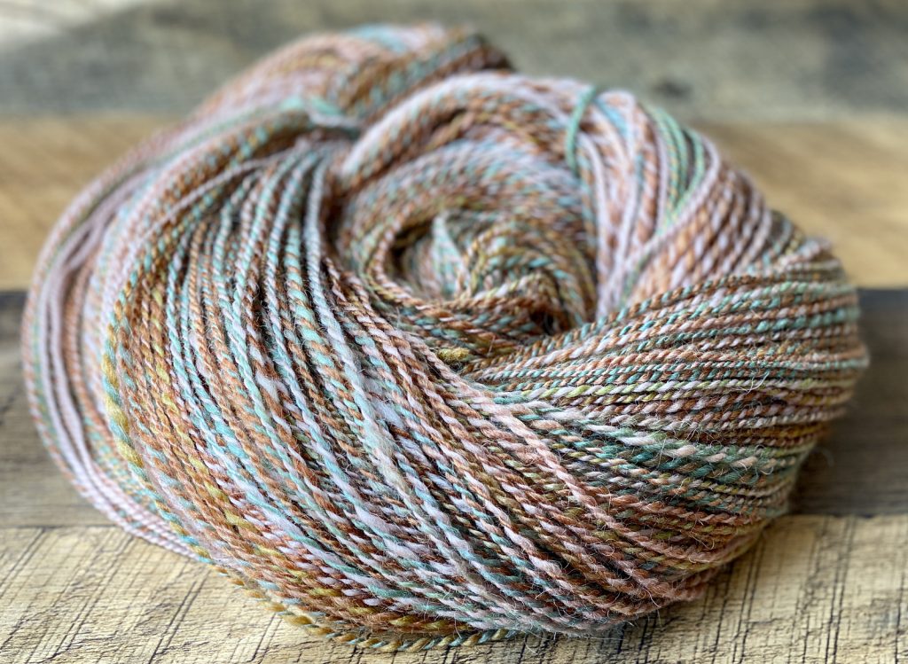 I’ve been knitting more socks this year and really love making them with handspun. Normally I’d spin a sturdy, twisty 3-ply for socks, but since I only had a little over 5 oz of fiber, I spun this as a 2-ply so I’d have enough yarn. I decided to spin it on my Starling V3 e-spinner, which is a fun little tool that took a little while to get used to.
