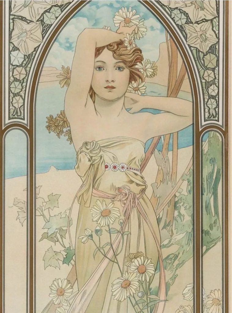 I really love the soft, summery colors in this fiber. Partway through spinning, I looked up and realized that the colors flowing through my fingers exactly matched the print on my wall! Alphonse Mecha’s Éclat du Jour is one of a series of 4 panels he painted in 1899 to depict the times of the day. This print is one of my favorites and was given to me by a dear friend. As soon as I get around to knitting the socks (I am considering Joji Locatelli’s Beachgrass Socks), I’ll be able to wear the Light of Day on my feet.