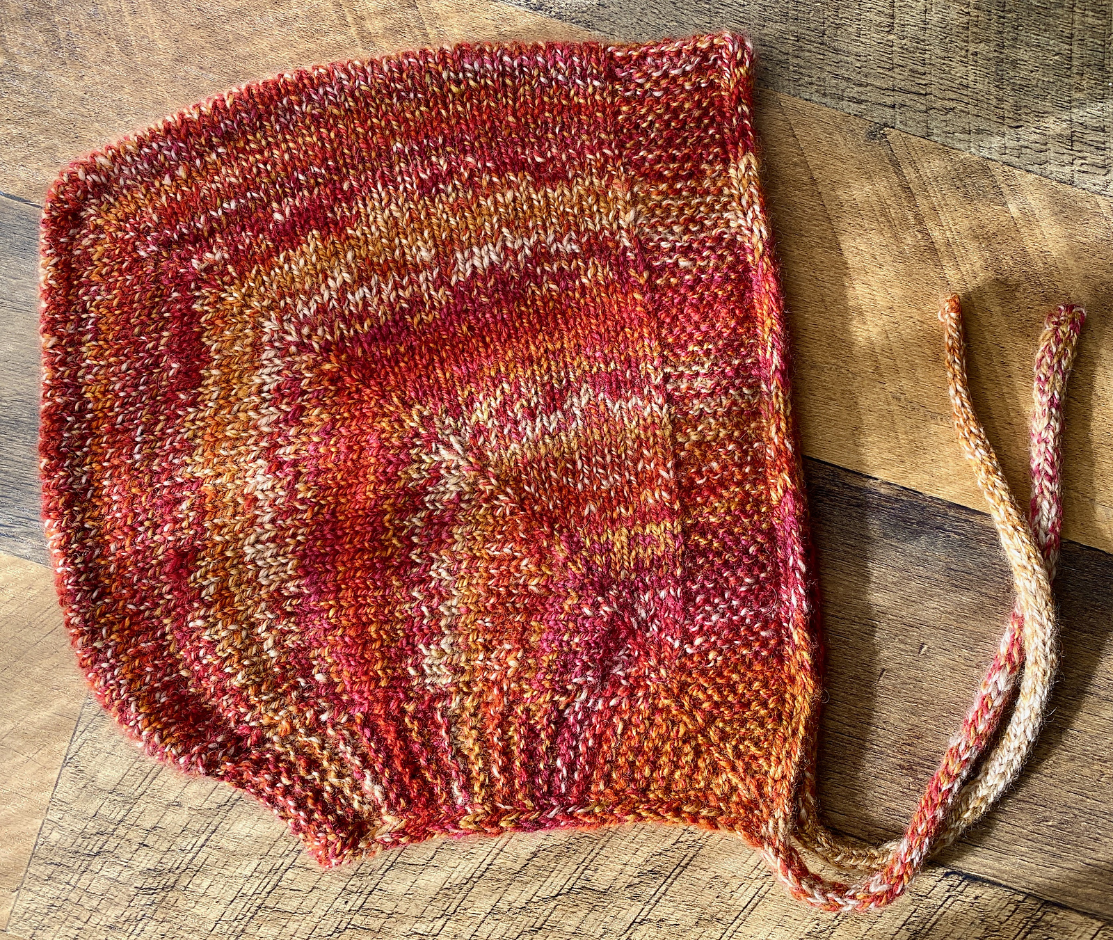 The Beloved Bonnet pattern comes in 5 sizes; I knitted the Adult size for a 22″ head circumference. After finishing, I tried it on several adults, and it is quite large. For some reason it didn’t occur to me that I’d want negative ease with a hat. If I make another one, I might go down a size for a snugger fit, and/or perhaps use sock yarn or something that is more consistently fingering weight.