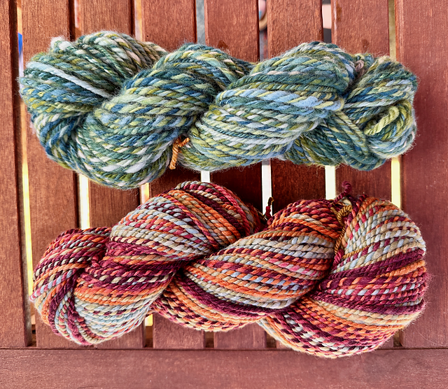 It also looks like the chain ply (top) may have tamed some of the woolen floof compared with the 2-ply spindle spun from rolags. This could be from overly aggressive chain plying, the increased tension of the wheel, and/or the fact that my very inexperienced spindle plying from a center pull ball resulted in a horrific tangled mess that took me hours and judicious use of very pointy scissors to straighten out.