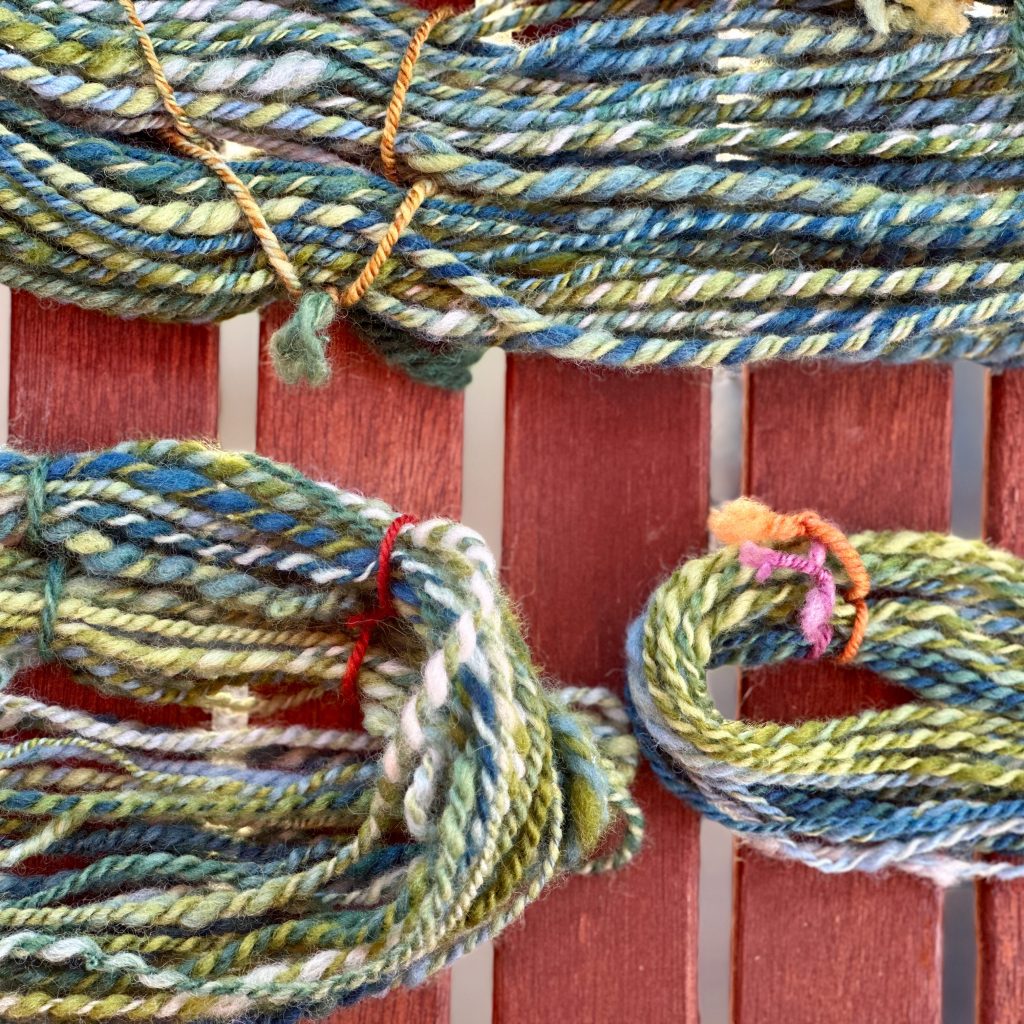 My finished yarn is 90 yards of chain ply at 6-7 WPI, making it on the thick side of bulky weight. It did fluff up a bit after the felting treatment. I very much like the loft and floof level, despite its unevenness. I can’t really tell whether I successfully semi-felted it, but that may be come more apparent when I knit with it.