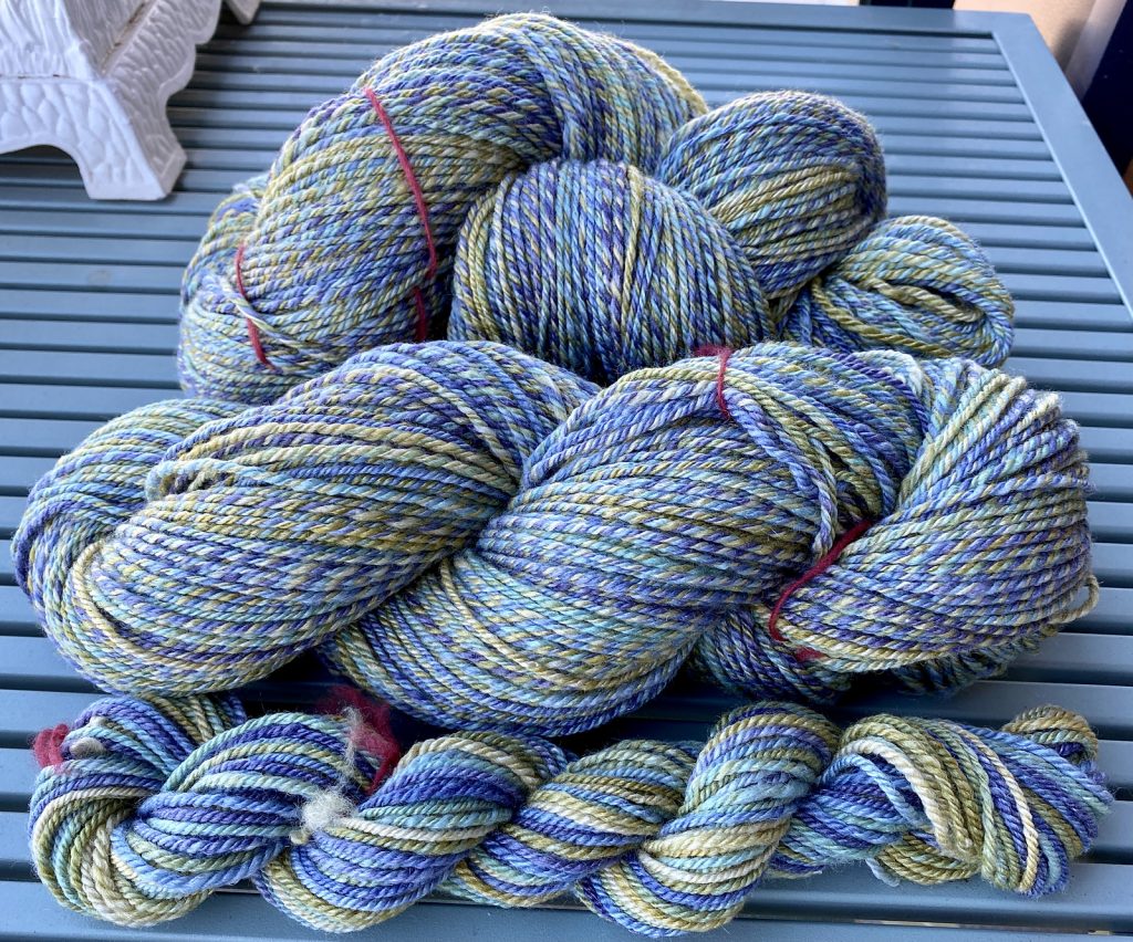 For this project I chose Provence, a lavender and green yarn I spun back in 2020 that was just waiting for the right project. The hand dyed fiber was from Nest Fiber Studio right here in Boulder, and it’s a blend of Falkland wool, silk, and mint fiber. Yes, mint, the plant! I expected it to smell minty but it didn’t at all. I spun this on a Schacht Sidekick, a genius little workhorse of a folding spinning wheel, which I ended up selling later but kind of miss now. Due to COVID lockdown it took me just 4 months to spin just under 13 ounces of fiber, which is pretty quick for me. I ended up with just over 1,000 yards of sport weight 3-ply, and a bit of chain ply with the inevitable leftover singles.