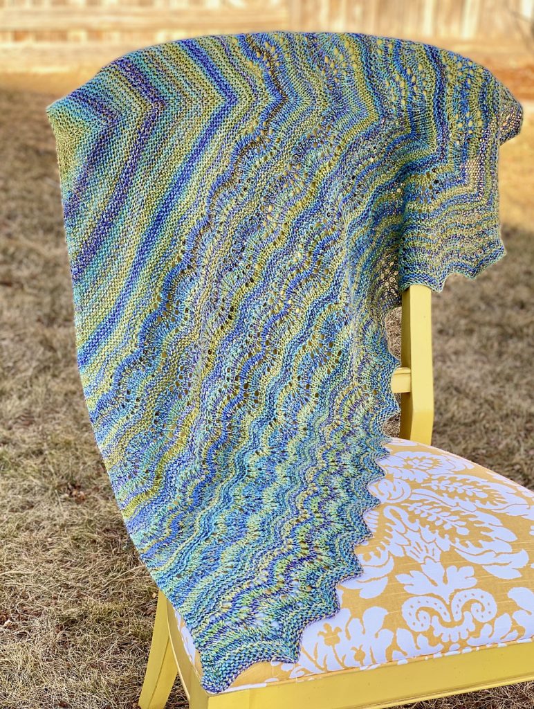 The pattern is written for both sport weight and DK weight versions. It is very clear about making the shawl as large or small as you like, and tells you how to determine how much yarn you’ll need to bind off so you don’t run out. I finished up by early December. I did five repeats of the easy lace pattern, which took a little over 800 yards of yarn (I’m using the rest in a scrappy blanket project).